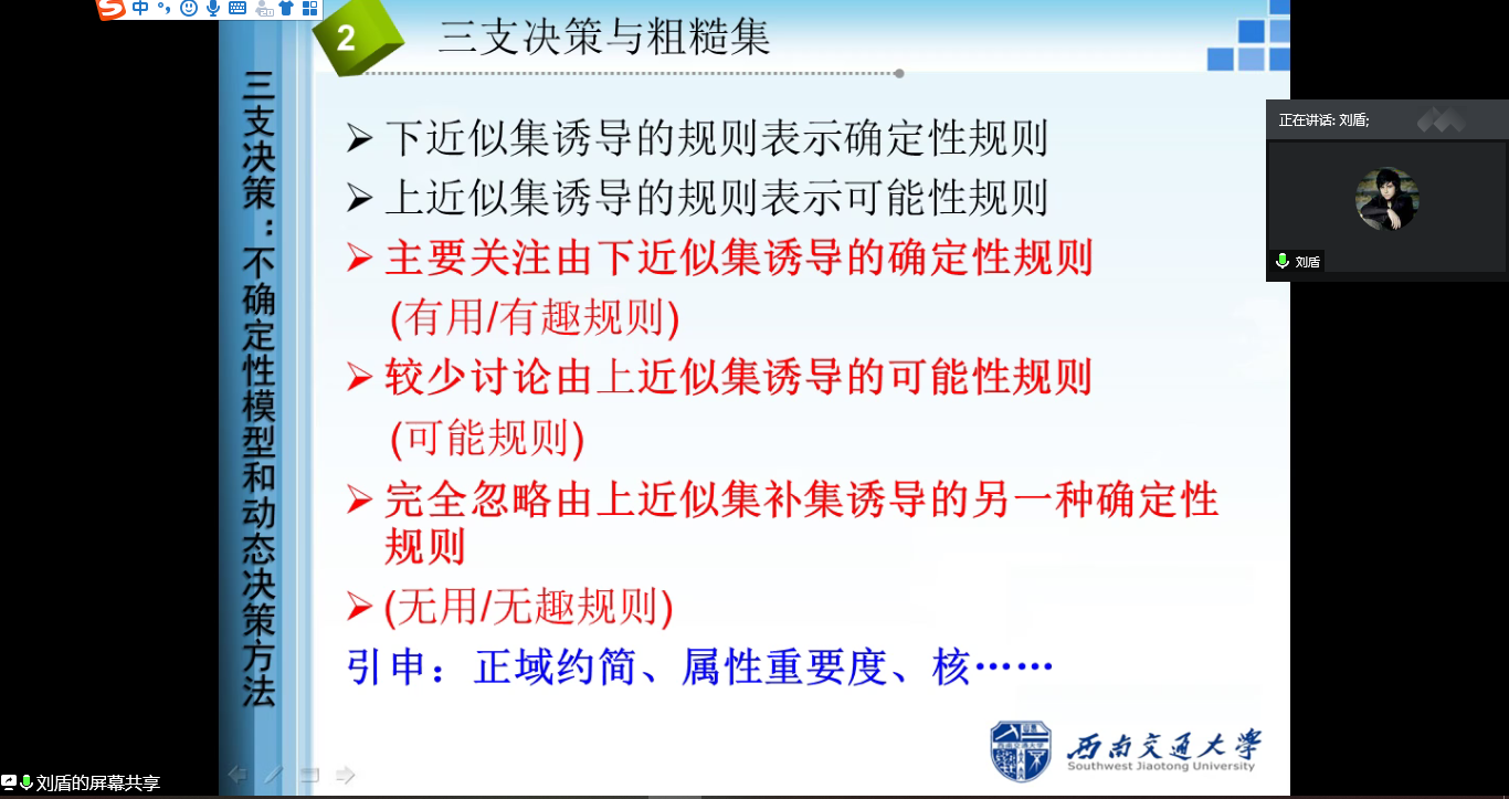 应公司邀请,7月4日上午,西南交通大学刘盾教授在腾讯会议作了题为《三支决策:不确定性模型和动态决策方法》的报告。相关师生聆听了此次报告,报告由廖淑娇副教授主持。