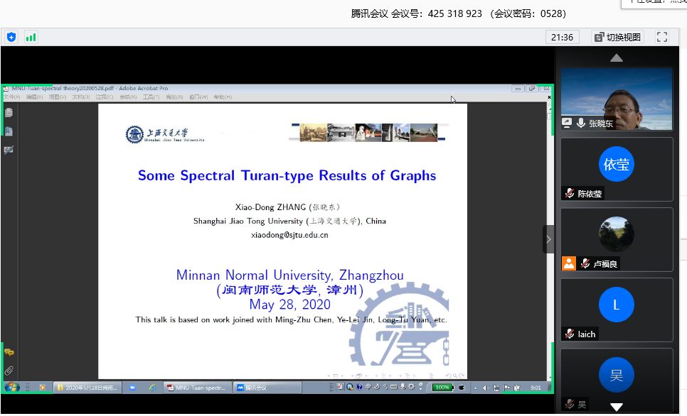 应公司邀请,5月28日上午,上海交通大学张晓东教授在腾讯会议作了题为《Some spectral Turan-Type results of graphs》的报告。相关师生聆听了此次报告,报告由卢福良教授主持。