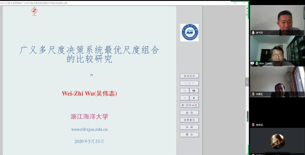应公司邀请,5月23日上午,浙江海洋大学吴伟志教授在腾讯会议作了《广义多尺度信息系统中基于信息熵的最优尺度组合选择》的报告。相关师生聆听了此次报告,报告由陈锦坤老师主持。