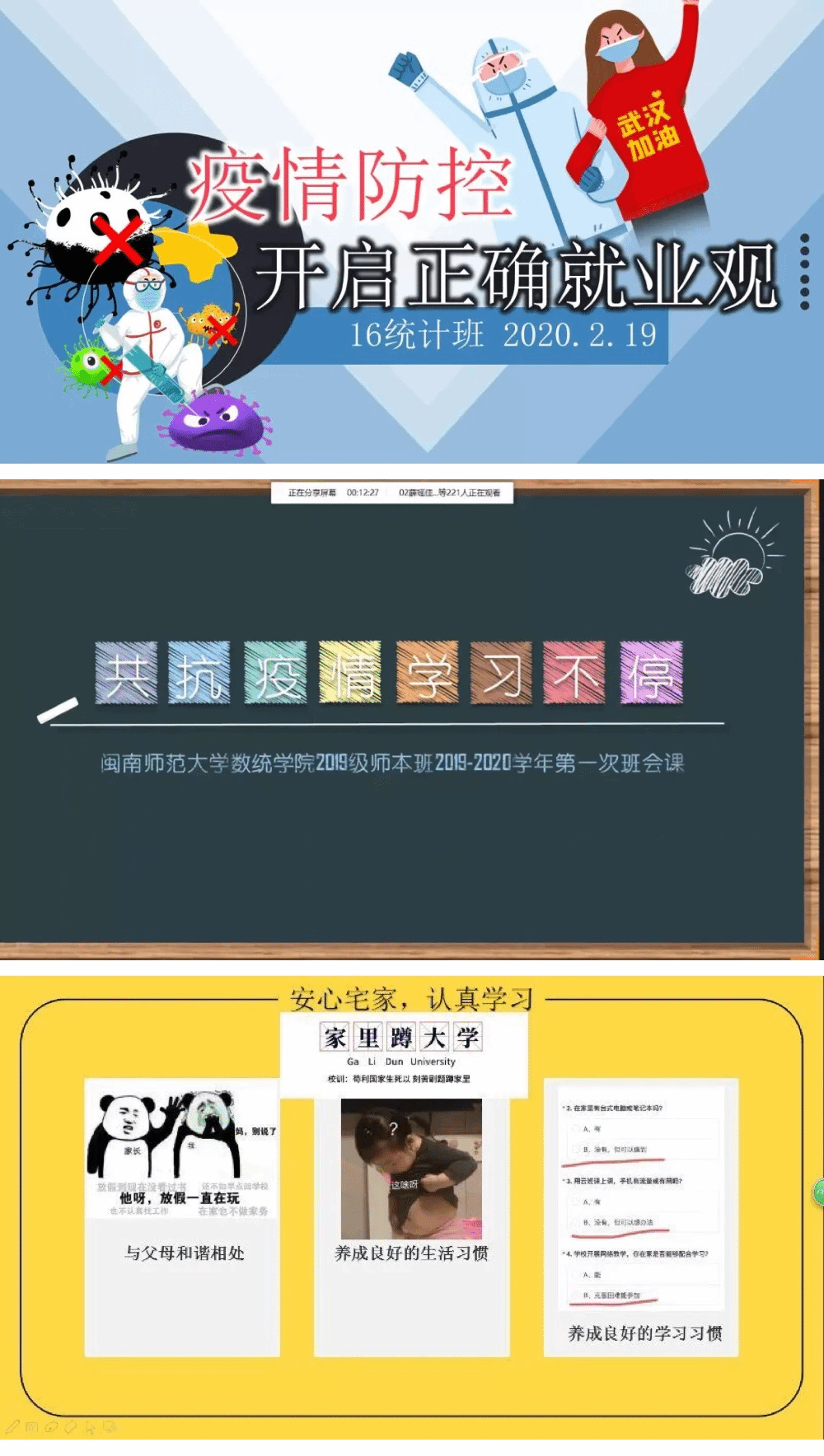2019级辅导员许晴与张赫分别以“共抗疫情,学习不停”和“齐心抗疫情,宅家学习”为主题为2019级的同学们开展班会课。两位老师均组织同学们了解抗击心冠肺炎的有关情况,倡议同学们同心抗疫,并敦促同学们在疫情期间自觉学习。此外,许老师建议同学们如若出现心理不适情况,可以向学院老师或校心理咨询中心咨询。