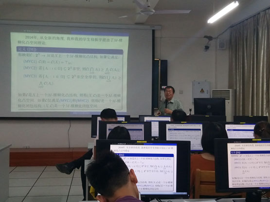报告中,史福贵教授首先介绍了L-凸空间的定义,并且给出了几个L-凸空间的例子;其次从全新的角度,提出了M-模糊化凸空间理论,介绍了M-模糊化凸结构的定义并阐述了其定义的合理性;然后详细阐述M-模糊化闭包空间和M-模糊化凸包算子,说明了M-模糊化闭包空间与M-模糊化闭包算子的关系,并介绍了M-模糊化闭包空间的几个等价命题;最后详细讲述了M-模糊化区间,很好地解决了M-模糊化凸空间和M-模糊化区间空间的相互诱导关系。报告结束后,在座的师生就相关研究问题进行了探讨和交流。