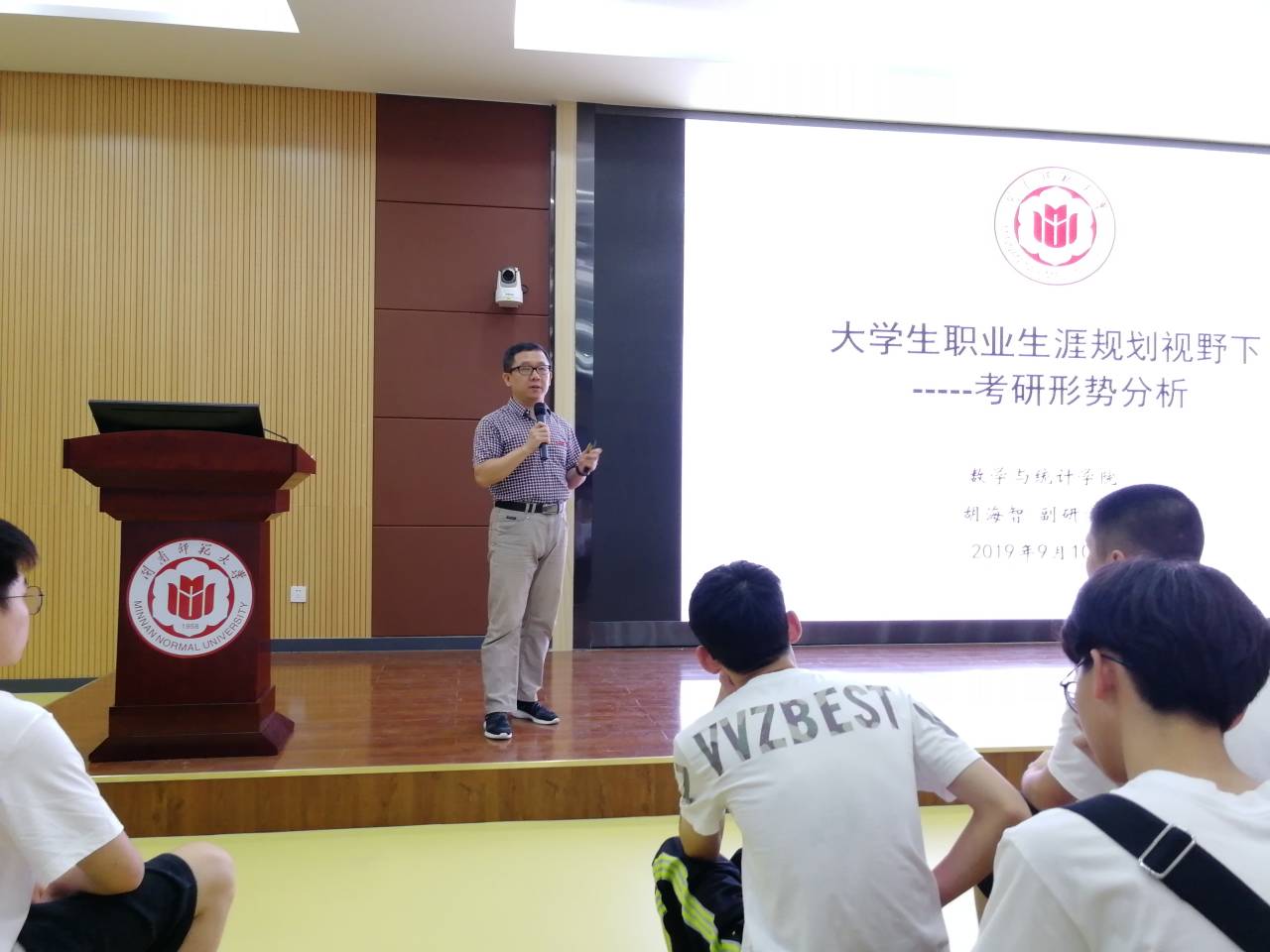 9月10日下午,学院副经理胡海智在砺志楼120为新生开展关于老员工职业规划视野下考研形势分析讲座。胡海智通过图表对近年来高校扩招,我国即将由高等教育大众化阶段进入普及化阶段的现状进行全面的介绍,深入分析了考研人数持续增长考研形势。并对全日制与非全日制学习方式、学术硕士与专业硕士的区别、推免生政策、研究生奖助政策、BV伟德官方网站专业分类、专业选择以及研究生入学考试科目、专业复习等方面进行详细讲解,鼓励广大新生要发扬高考拼搏进取的精神,尽早确立自己的人生规划和目标,早定位、早复习,形成良好的学习习惯,营造浓厚的学习氛围,为目标不懈奋斗。
