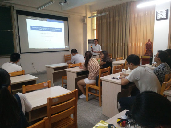 张剑文教授首先介绍了可压缩圆柱纳维-斯托克斯方程、可压缩平面MHD方程的边值解问题;其次阐述了其渐进性质并作了证明,如证明消失剪切粘度极限,得到了收敛速度;接着构造了一个合适的校正函数(即所谓的边界层型函数)来消除边界值的差异;最后张剑文教授对其所讲述的内容进行了简要总结。报告结束后,在座师生就相关研究进行了探讨和交流。