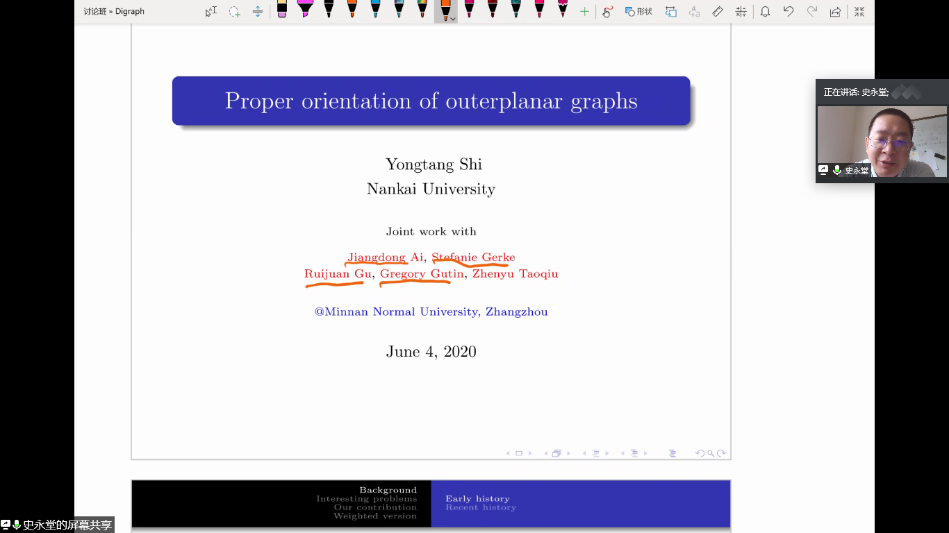 应公司邀请,6月4日上午,南开大学史永堂教授在腾讯会议作了题为《Proper orientation of outerplanar graphs》的报告。相关师生聆听了此次报告,报告由卢福良教授主持。