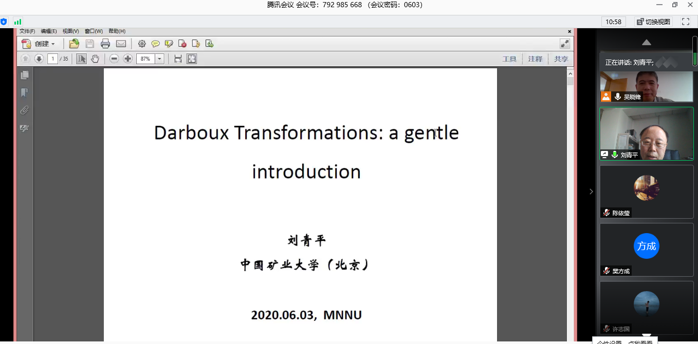 应公司邀请,6月3日上午,中国矿业大学(北京)刘青平教授在腾讯会议作了题为《Darboux transformations——a gentle introduction》的报告。相关师生聆听了此次报告,报告由吴晓峰教授主持。
