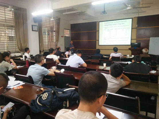在报告中,美国北卡罗莱纳大学彭布罗分校卫国教授首先详细介绍了一些基本概念,如凸对策等等;其次讲述了一些重要方法,如Mobius变换和Choquet积分;然后向我们介绍了在不确定性研究中常用的几种重要理论,包括Choquet容量和积分、Dempster-Shafer证据/信念函数理论、不确定性理论、模糊集合论、邓-刘灰色系统理论和粗糙集理论。最后卫国教授阐述了这些理论之间的关系。报告结束后,在座的老师和员工就相关研究问题进行了探讨和交流。