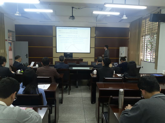 松永秀章教授在报告中,首先阐述了时滞微分方程,并推荐了几本关于时滞微分方程的书籍,然后用计算机模拟出其图像,同时介绍它的渐近稳定性;然后讲述了线性时滞微分方程的渐近稳定性与振动性;接着介绍线性时滞差分方程的渐近稳定性与振动性。结束后,在座的老师和员工就相关问题进行了探讨。