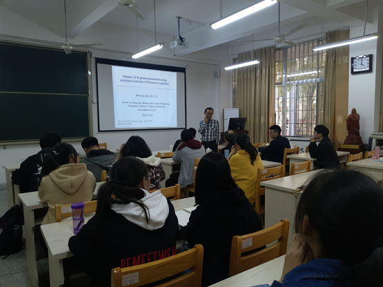 朱文兴教授在报告中首先阐述了集成电路设计自动化的研究背景,其中详细讲述了设计过程中的难题——VLSI布局,其中布局流程首先是球形布局,然后标准化,最后详细化;然后阐述了用泊松方程的解析解来解决这个难题;接着朱文兴教授又向我们介绍了一种优化后的快速计算方案,同时将其计算结果同ePlace的计算结果作比较;随后,简要的介绍了算法流程和优化方法;最后将实验结果和结论进行了总结。报告结束后,在座师生就相关研究进行了探讨和交流。