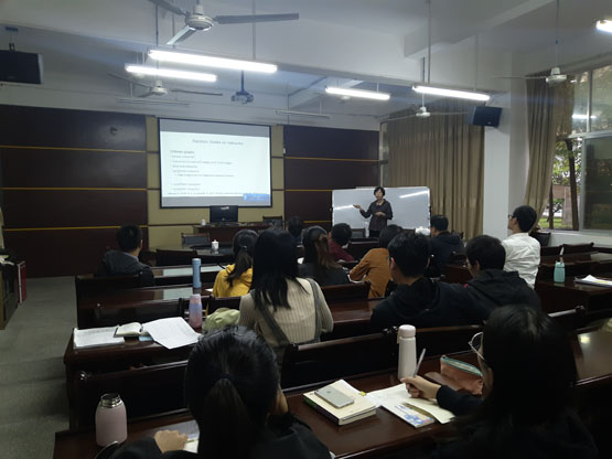 樊瑛教授在报告中首先说明了什么是网络随机游走,并阐述了其相关应用。随后介绍了社团挖掘的Walktrap算法,说明了符号网络具有负边和正边,接着讲述了符号网络上的随机游走。其中主要讨论了基于负边算法不同的游走规制对社团挖掘的影响。最后对游走规制的研究给出了新思路,并就相关问题进行了讨论。报告结束后,在座师生就相关研究进行了探讨和交流。