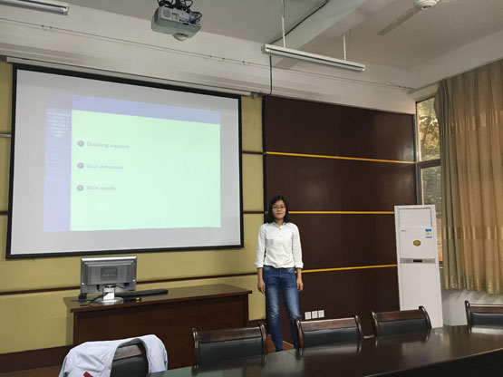 在《On distribution of local dimensions of doubling measures on Euclidean space》的报告中,彭峰集副教授主要介绍欧式空间中加倍测度的局部维数分布。首先介绍了加倍测量及测度的局部维数的相关概念及性质,而后重点阐述在[0,1]n上加倍测度的局部维数的一些基本定理,还有测量的较低局部维数的分布。最后介绍了她目前正在研究的主要成果的证明。报告结束后,在座的老师和员工就相关研究问题进行了探讨和交流。