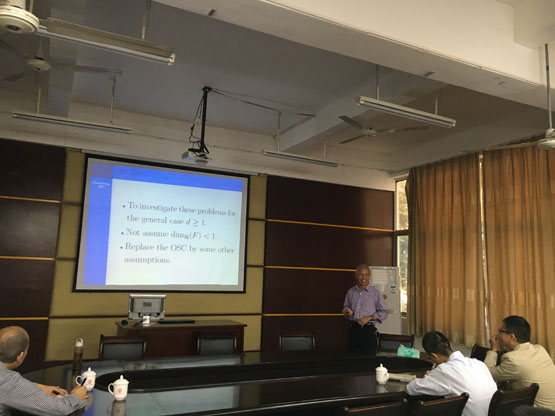 在报告《Structure of the class of iterated function systems that generate the same self-similar set》中,邓起荣教授主要讨论了一个基本而有趣的问题:什么样的迭代函数系统能生成同一个自相似集。在报告中,邓教授知识渊博、幽默风趣,为大家展示了其简洁而优美的结果。报告结束后,在座的老师和员工就相关研究问题进行了探讨和交流。
