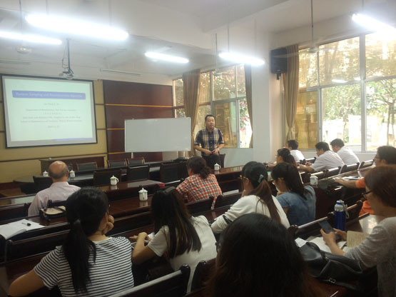 报告结束后,冼军教授与在座的老师和研究生进行了座谈。在场师生就平移不变信号空间中(随机)采样与恢复及其应用进行了探讨和交流。