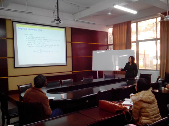 12月18日上午,钱莲芬教授在砺志楼114作了题为《Empirical Likelihood Methods for Longitudinal Data》的报告,报告由副经理蔡建平教授主持。钱教授主要围绕Empirical Likelihood、Longitudinal Data、Framingham Heart Study、Link between EL and LD、Partial Linear Model、Two EL Based Methods、SW EL Method、Main Results、Simulation、Application十个方面介绍了经验似然估计方法在纵向数据中的应用。