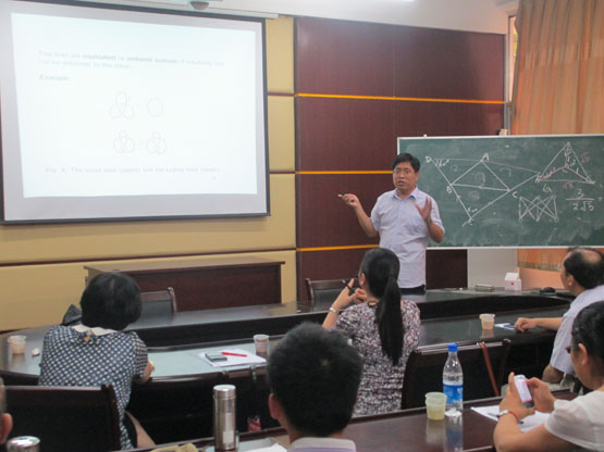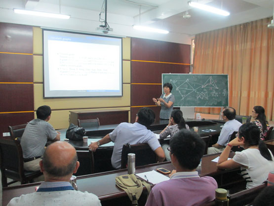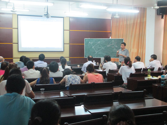 首先,董峰明副教授作了题为《Two Optimization Problems in Plane Geometry》的报告,主要从三角形出发介绍了两个优化问题,其中一个是平面上的Steiner Tree 问题,另外一个问题是关于寻找给定的N边形的最大外接等角N边形。接着,厦门大学数学科学学院博士生导师张莲珠教授做了题为《The Problem of Pfaffian Orientations on Graphs》的报告,主要介绍了Defnition and Notations、The Problem on Enumerating Perfect Matchings、Contractions、Compressions、Three Minimal non-Pfaffian Graphs等内容。最后,厦门大学数学科学学院博士生导师金贤安教授做了题为《Several Simple Problems on Plane Graphs in Knot Theory》的报告,主要从Links and Graphs、Several indices on plane graphs、Two open problems进行了深入介绍。