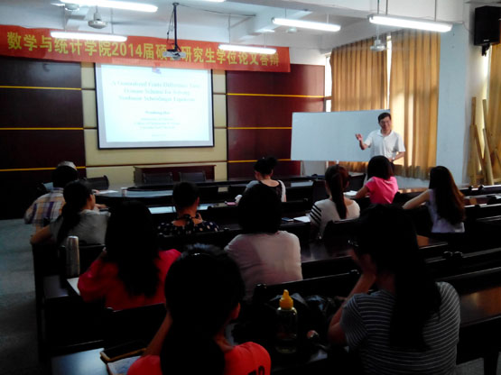 首先,戴教授作了题为《A Generalized Finite Difference Time Domain Scheme for Solving Nonlinear Schrödinger Equations》的精彩报告,主要从Introduction、Generalized FDTD Method 、Theoretical Analysis、Numerical Examples、Application、Summary六个方面介绍了推广的有限差分时域方法的基本理论。