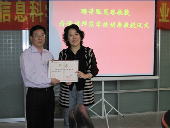 2010年4月29日,厦门大学数学科学学院博士生导师张莲珠教授应我邀来我系讲学。在励志楼114举行了“聘请张莲珠教授为漳州师范学院讲座教授”仪式,李进金副经理给张莲珠教授颁发讲座教授聘书。仪式之后,张教授做了一场题为《Pfaffians 方法和完美匹配的计数》的学术报告。