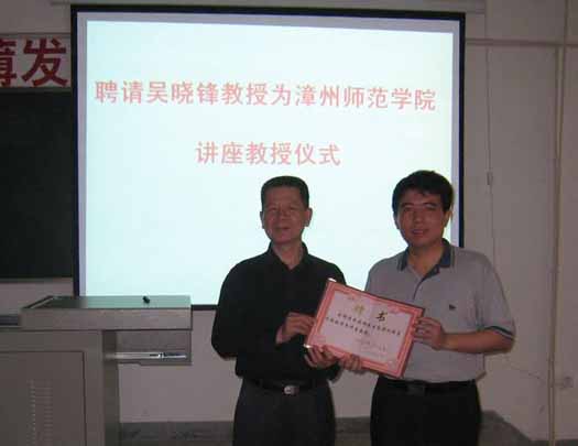 在讲座中,吴教授首先介绍了庞加莱、伯克霍夫、洛仑兹等数学家对混沌理论的主要贡献,随后介绍了一些基础数学家、应用数学家的故事。该讲座围绕“混沌是如何发现的、混沌的特征是什么以及混沌如何进行数学定义和证明”展开,有趣的故事、通俗易懂的语言、丰富的表情博得在场师生阵阵热烈掌声。讲座结束后,举行了“聘请吴晓锋教授为漳州师范学院讲座教授”仪式,系主任陈协彬教授为吴教授颁发聘书,现场气氛异常热烈,掌声经久不息。