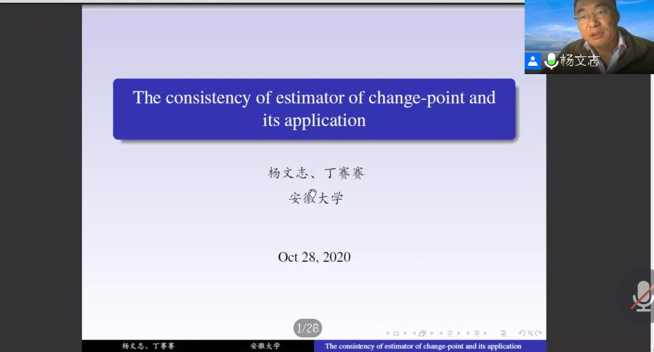 应公司邀请,10月28日晚上,安徽大学杨文志副教授在腾讯会议作了题为《The consistency of estimator of change-point and its application》的报告。相关师生聆听了此次报告,报告由施建华副教授主持。