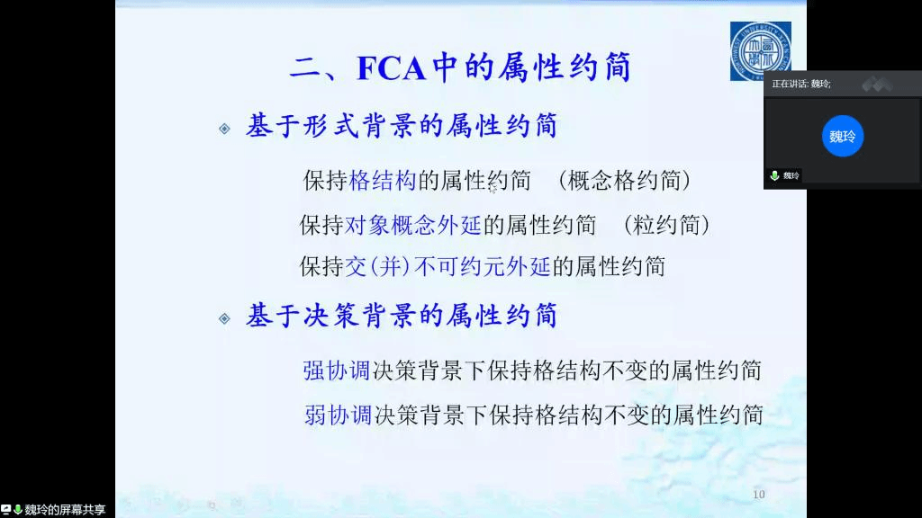应公司邀请,12月19日,西北大学魏玲教授在腾讯会议作了题为《FCA中的属性约简与概念约简》的报告。相关师生聆听了此次报告,报告由廖淑娇副教授主持。