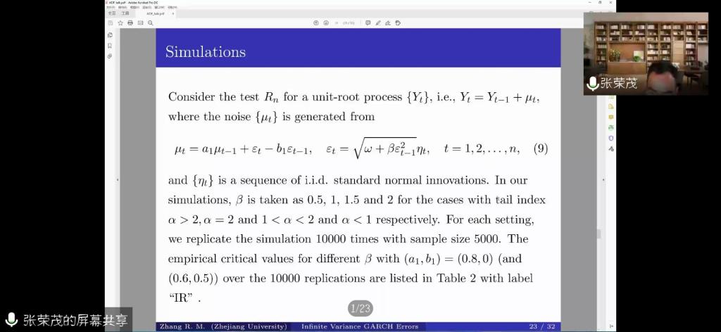 应公司邀请,12月14日下午,浙江大学张荣茂教授在腾讯会议作了题为《Nonstationary Linear Processes with Infinite Variance GARCH Errors》的报告。相关师生聆听了此次报告,报告由施建华教授主持。