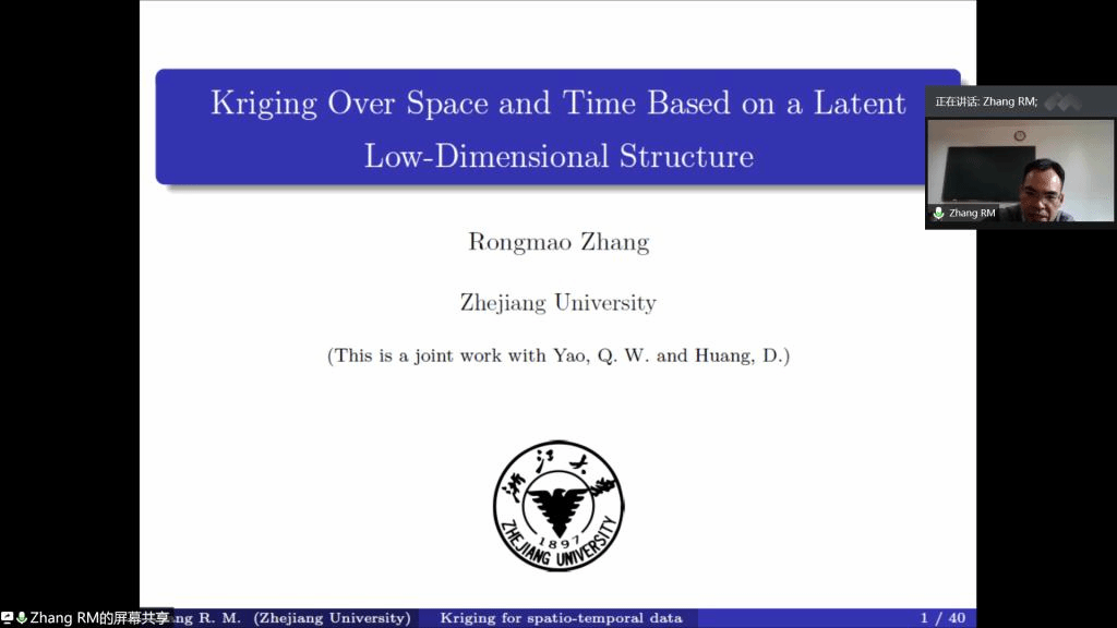 应公司邀请,12月21日下午,浙江大学张荣茂教授在腾讯会议上作了题为《KrigingsOver Space and Time Based on a Latent Low-Dimensional Structure》的报告。相关师生聆听了此次报告,报告由施建华教授主持。