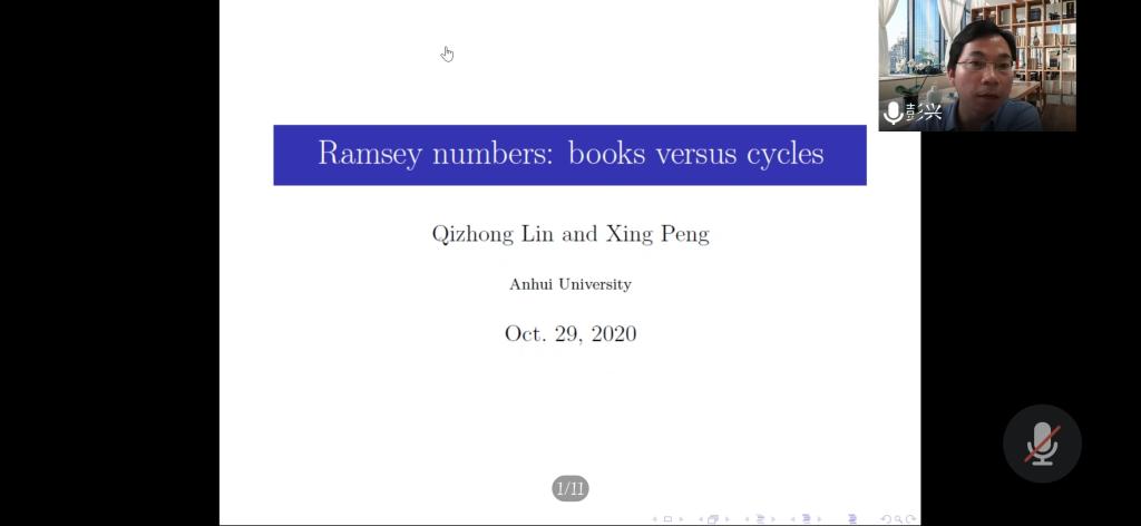 应公司邀请,10月29日下午,安徽大学彭兴副教授在腾讯会议作了题为《Ramsey number of Books versus Cycles》的报告。相关师生聆听了此次报告,报告由卢福良教授主持。