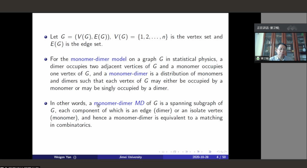 应公司邀请,10月28日下午,集美大学晏卫根教授在腾讯会议作了题为《Using edge generating function to solve monomer-dimer problem》的报告。相关师生聆听了此次报告,报告由卢福良教授主持。