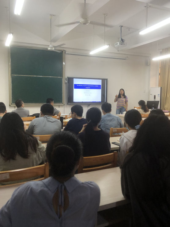是cocomplete的条件。接着,讲解了在阿贝尔范畴上的recollement结构,介绍了在comma范畴上的其他recollement,阐述了recollement的等价条件。最后,黄菊博士提出了自己在这个领域上有待解决的几个问题。报告结束后,在座的师生就相关研究问题进行了探讨和交流。