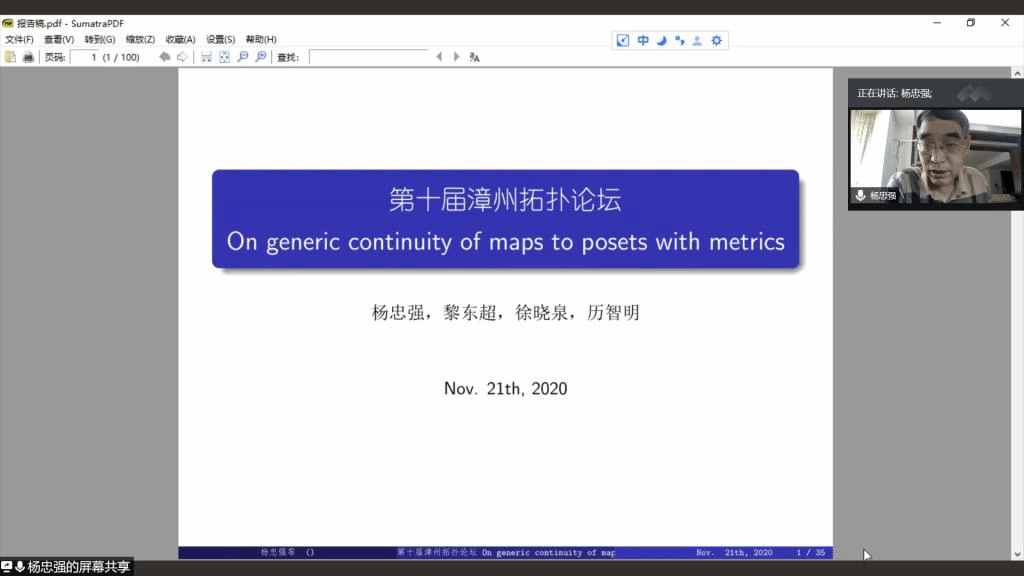 应公司邀请,11月21日上午,BV伟德官方网站杨忠强教授在腾讯会议作了题为《On generic continuity of maps to posets with metrics》的报告。相关师生聆听了此次报告,报告由林福财教授主持。