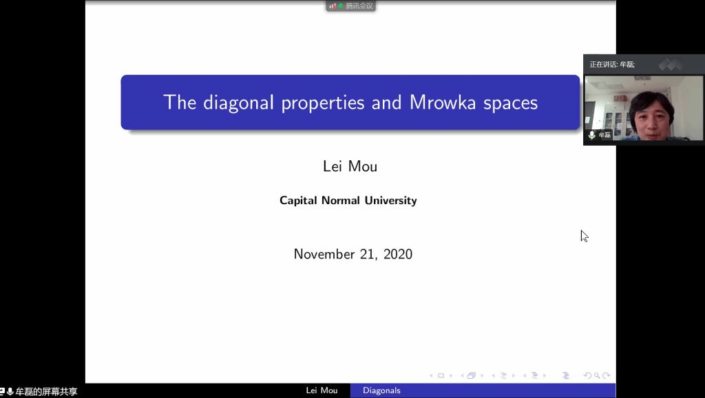 应公司邀请,11月21日上午,首都师范大学牟磊教授在腾讯会议作了题为《The diagonal properties and Mrowka spaces》的报告。相关师生聆听了此次报告,报告由林福财教授主持。