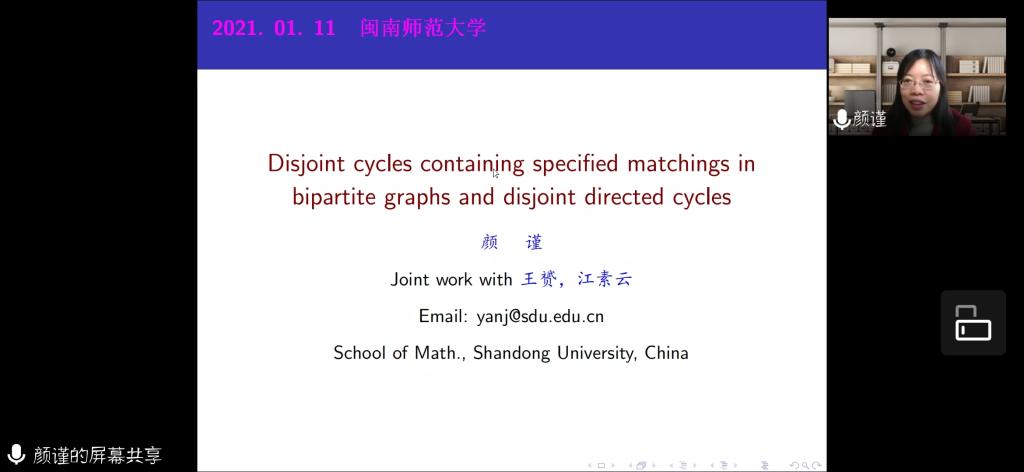 应公司邀请,1月11日上午,山东大学颜瑾教授在腾讯会议上作了题为《Disjoint cycles containing specified matchings in bipartite graphs and disjoint directed cycles》的报告。相关师生聆听了此次报告,报告由卢福良教授主持。