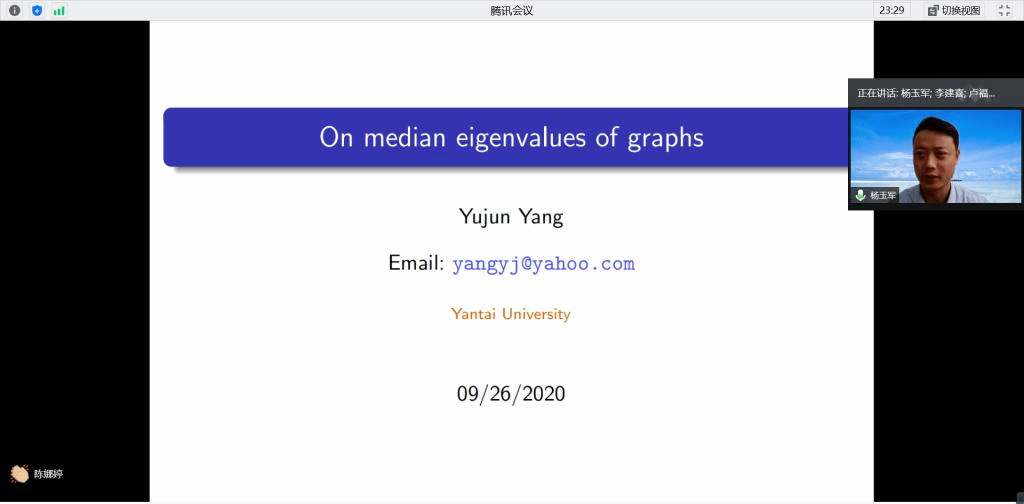 应公司邀请,10月15日下午,烟台大学杨玉军教授在腾讯会议作了题为《Median eigenvaules of graphs》的报告。相关师生聆听了此次报告,报告由李建喜副经理主持。