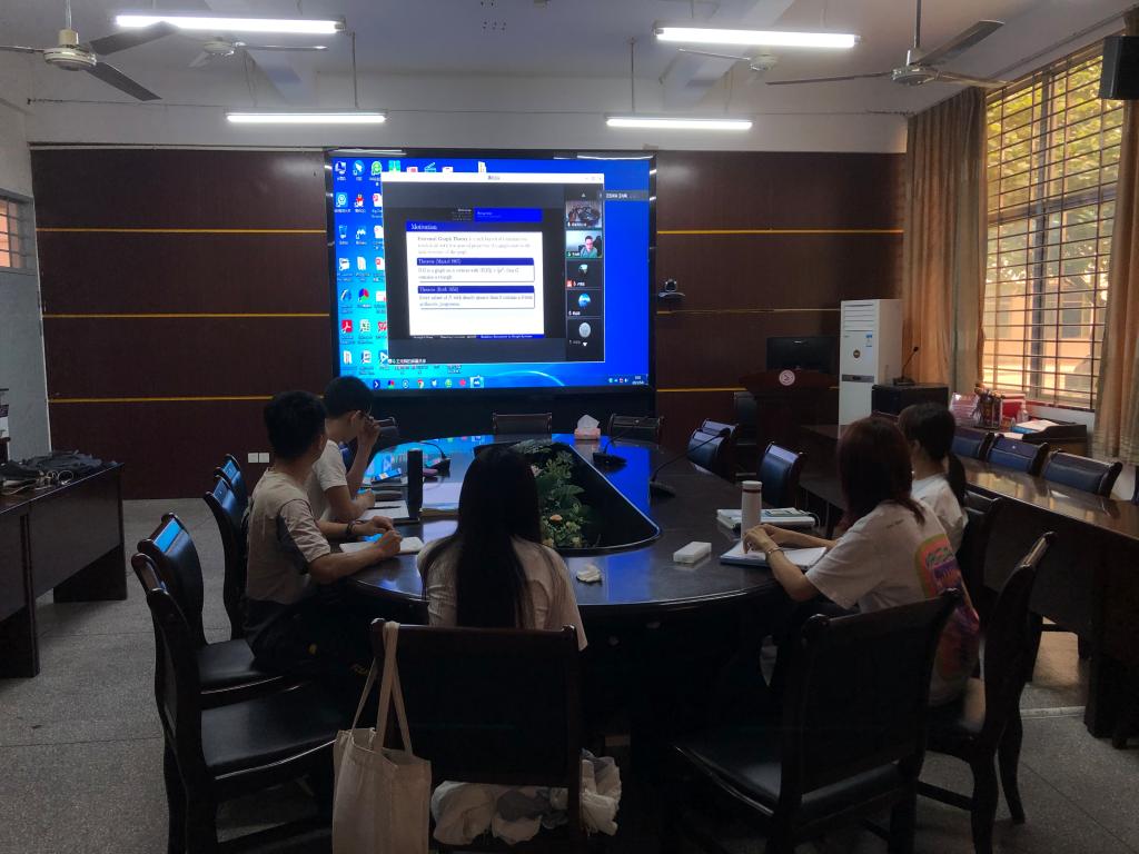 报告中,王光辉教授首先介绍了一系列图中研究子图包含问题的彩虹版本,阐述了图兰定理对于彩虹圈的重要性,然后证明了图系统中Hajnal-Szemeredi定理的渐近彩虹形式,最后向我们提供了攻击此类问题的通用框架。报告结束后,在座的师生就相关研究问题进行了探讨和交流。