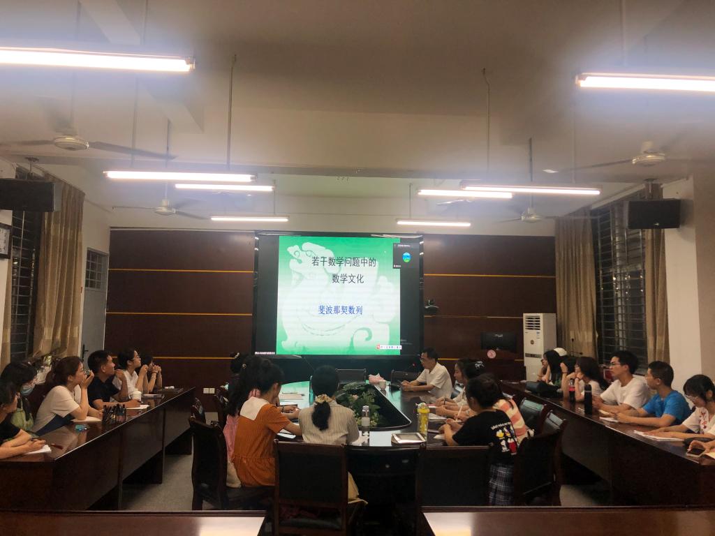 报告中,冯俊娥教授主要介绍了若干数学问题中的数学文化——斐波那契数列。首先以小游戏的形式导入了斐波那契数列的兔子问题的解释,通过列表、分析、抓本质,简化问题发现规律,得出了斐波那契数列的关系式。然后介绍了类似斐波那契数列的一些问题,如:跳格子问题、连分数、黄金矩形、黄金分割问题及其做图、优选法等等。发现美的东西与有用的东西之间常常是有联系的。最后介绍了斐波那契协会、斐波那契的生平、自然界中的斐波那契数列等等。报告结束后,在座的师生就相关研究问题进行了探讨和交流。