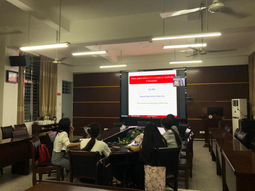 应公司邀请,6月3日晚上,浙江师范大学陈敏教授在腾讯会议作了题为《Planar graphs without $\{4,8,9\}$-cycles are acyclically 4-choosability》的报告。相关师生聆听了此次报告,报告由卢福良教授主持。