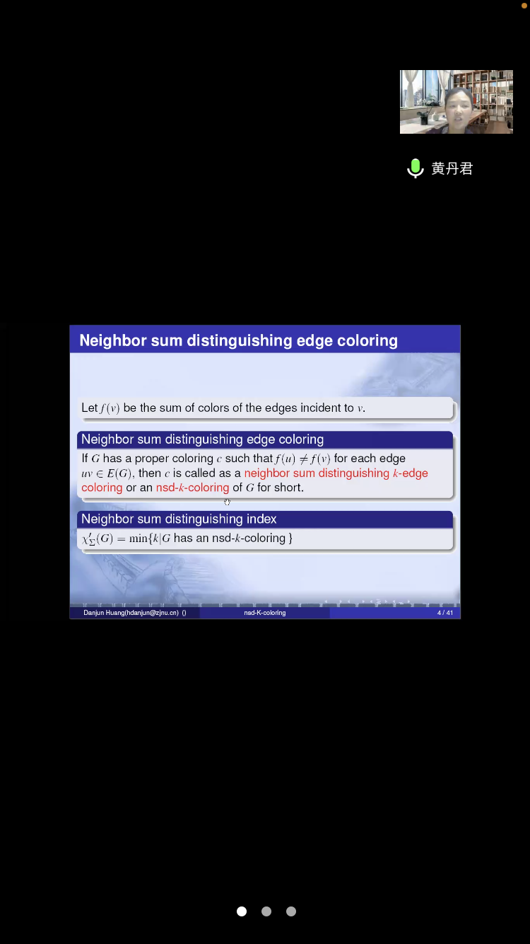 应公司邀请,6月4日下午,浙江师范大学黄丹君教授在腾讯会议作了题为《Neighbor sum distinguishing index of sparse graphs》的报告。相关师生聆听了此次报告,报告由卢福良教授主持。