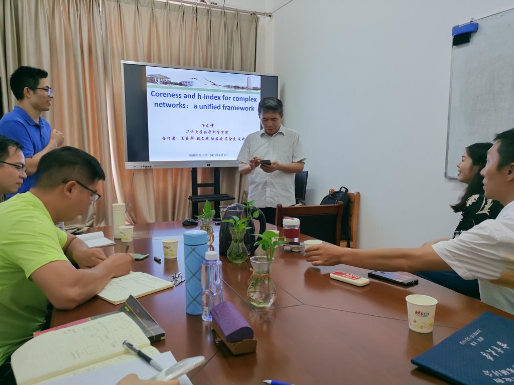 应公司邀请,6月5日晚上,华侨大学汤龙坤教授在八号楼404作了题为《复杂网络的Coreness和h-index:一个统一的框架》的报告。相关师生聆听了此次报告,报告由吴晓锋教授主持。