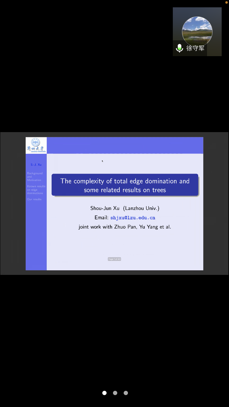 应公司邀请,7月31日下午,兰州大学徐守军教授在腾讯会议作了题为《The complexity of total edge domination and some related results on trees》的报告。相关师生聆听了此次报告,报告由李建喜副经理主持。
