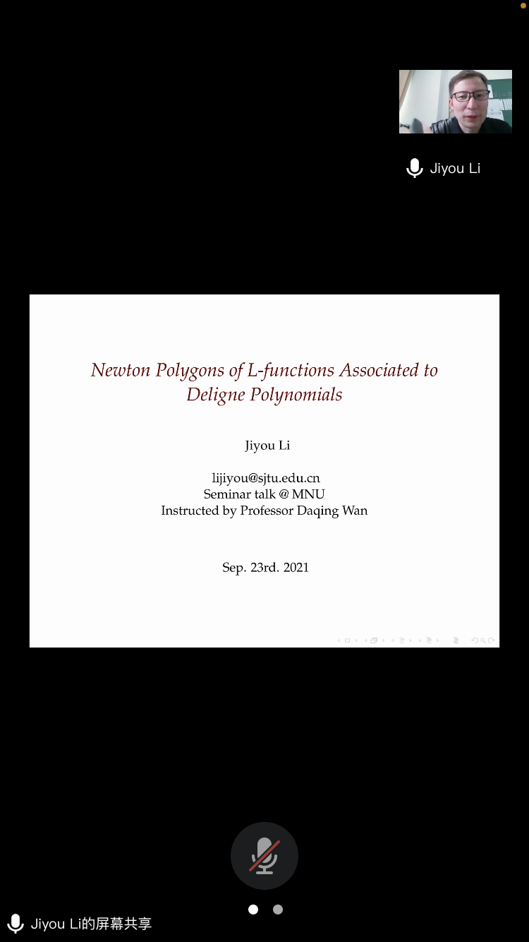 应公司邀请,9月23日上午,上海交通大学李吉有教授在腾讯会议作了题为《Newton Polygons of L-functions Associated to Deligne Polynomials》的报告。相关师生聆听了此次报告,报告由曹炜教授主持。