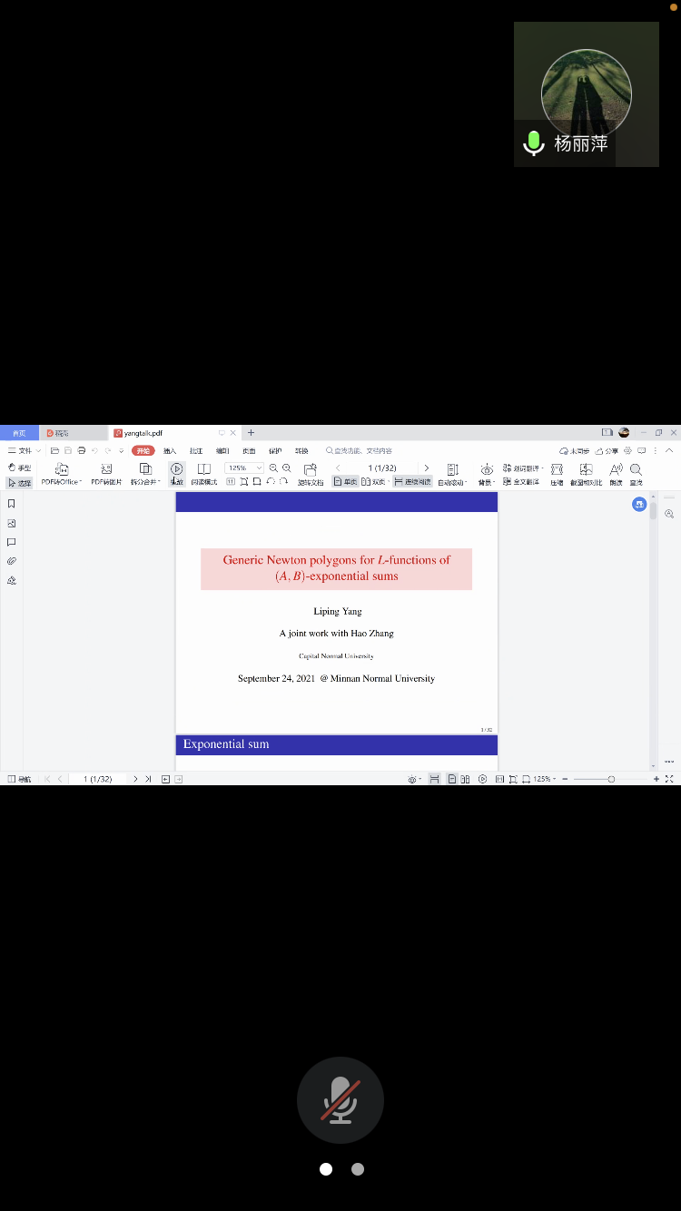 应公司邀请,9月24日上午,首都师范大学杨丽萍博士后在腾讯会议作了题为《Generic Newton polygons for L-functions of (A,B)-exponential sums》的报告。相关师生聆听了此次报告,报告由曹炜教授主持。
