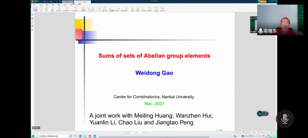 应公司邀请,10月20日上午,天津大学高维东教授在腾讯会议作了题为《SUMS OF SETS OF ABELIAN GROUP ELEMENTS》的报告。相关师生聆听了此次报告,报告由曹炜教授主持。