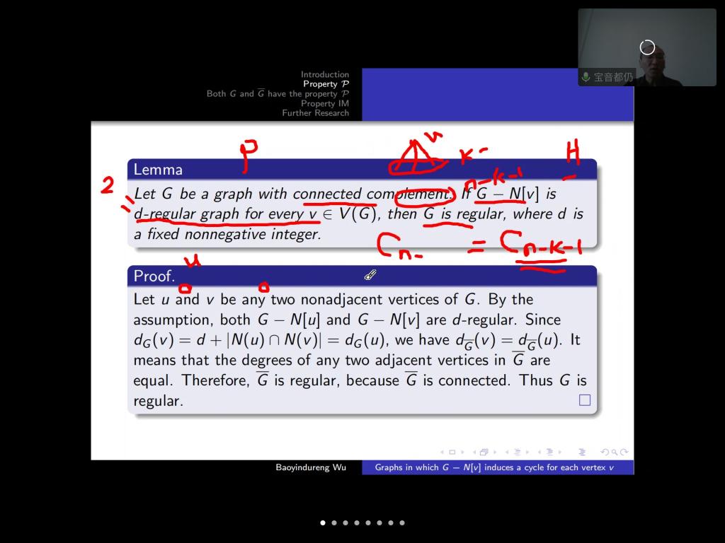 报告中,宝音都仍教授主要介绍了对于任意图G去除任意顶点v的所有邻点所具有的固定的性质p。首先宝音都仍教授介绍了性质p的定义—若G-N[v]是圈,对于任意的v,然后宝音都仍教授介绍了具有这一性质p的4种图类,并说明了这4种图满足性质p的证明过程。报告结束后,在座的师生就相关研究问题进行了探讨和交流。