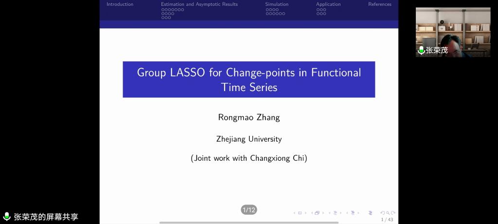 应公司邀请,12月8日上午,浙江大学张荣茂教授在腾讯会议作了题为《Group LASSO of Change-points in Functional Time Series》的报告。相关师生聆听了此次报告,报告由吕阳阳博士主持。