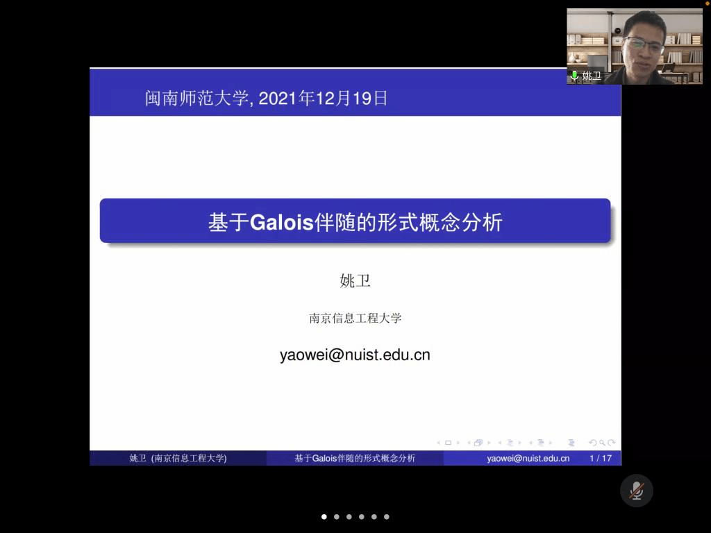 应公司邀请,12月19日下午,南京信息工程大学姚卫教授在腾讯会议作了题为《基于Galois伴随的形式概念分析》的报告。相关师生聆听了此次报告,报告由李进金老师主持。
