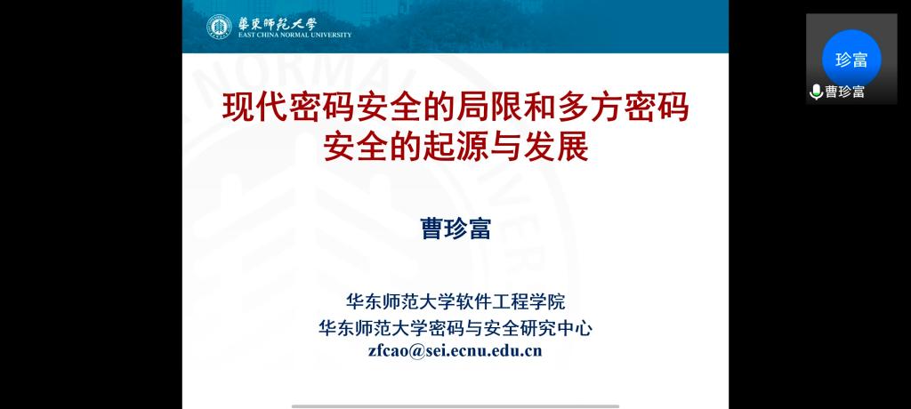 应公司邀请,12月22日上午,华东师范大学曹珍富教授在腾讯会议作了题为《现代密码安全的局限和多方密码安全的起源与发展》的报告。相关师生聆听了此次报告,报告由曹炜教授主持。