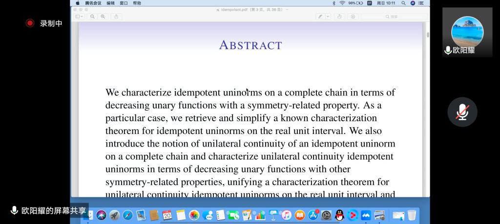 应公司邀请,2月20日早上,湖州师范学院欧阳耀教授在腾讯会议作了题为《dempotent uninorms on a complete chain》的报告。相关师生聆听了此次报告,报告由李进金老师主持。