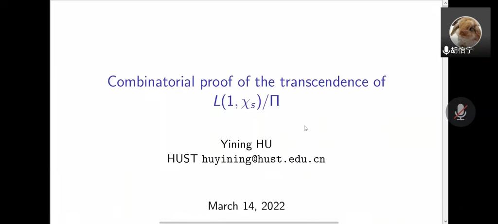 应公司邀请,3月14日下午,华中科技大学胡怡宁副教授在腾讯会议作了题为《Transcendence, Carlitz L function, and Automata》的报告。相关师生聆听了此次报告,报告由曹炜老师主持。