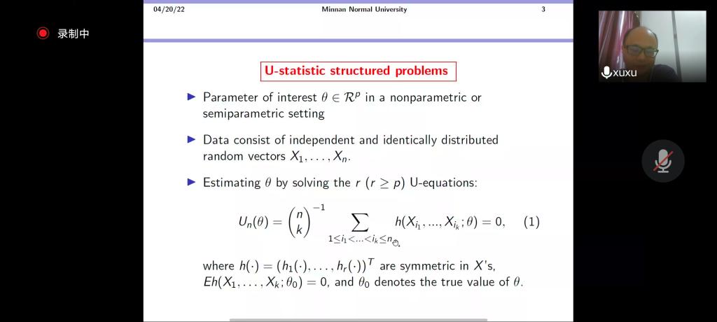 应公司邀请,4月20日下午,香港大学徐锦峰教授在腾讯会议作了题为《On penalized jackknife empirical likelihood with a diverging number of U estimating equations》的报告。相关师生聆听了此次报告,报告由施建华老师主持。