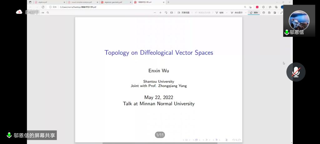 应公司邀请,5月22日早上,BV伟德官方网站邬恩信副教授在腾讯会议作了题为《Topology on diffeological vector spaces(广义向量空间上的拓扑)》的报告。相关师生聆听了此次报告,报告由杨忠强老师主持。