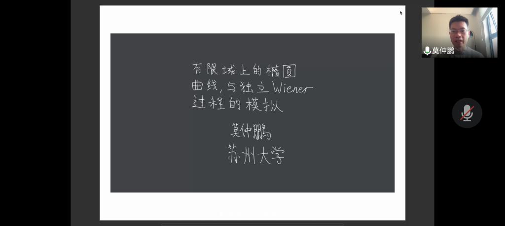 应公司邀请,5月27日下午,苏州大学莫仲鹏教授在腾讯会议作了题为《有限域上的椭圆曲线,与高维随机向量的模拟》的报告。相关师生聆听了此次报告,报告由曹炜老师主持。